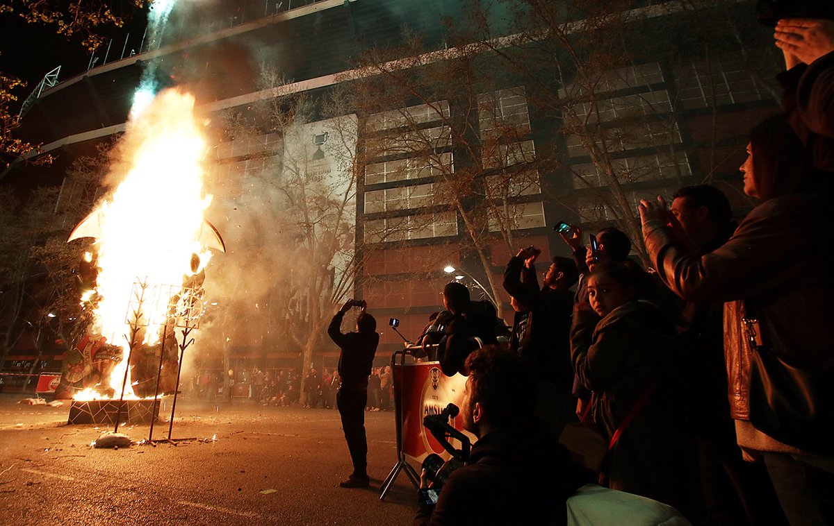 Previamente había tenido lugar uno de los actos más representativos de este día. Y es que en la plaza Luis Casanova se plantó ‘al tombe’ la Falla de l’Agrupació, un monumento confeccionado ex profeso para una efeméride tan especial. Un monumento que quedó reducido a cenizas entre los aplausos de las decenas de valencianistas que lo contemplaron.
